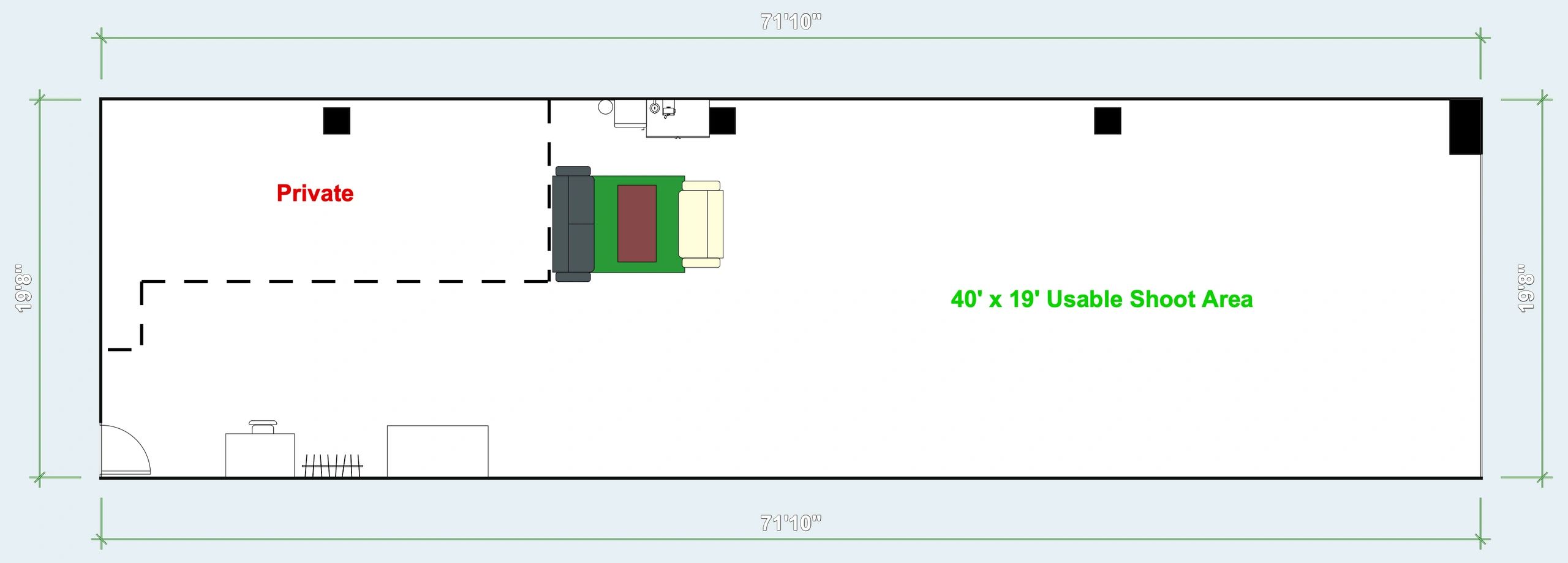 3-2-1 Shoot! offers a small studio space with 1000 sq. ft. of usable space available for daily rentals, catering to the needs of a wide range of commercial productions.